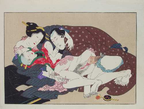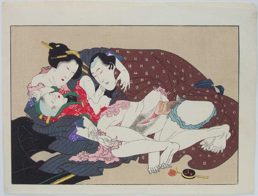 A colorful late-Meiji/Tasiho period "shunga" print. Unsigned--as is often typical due