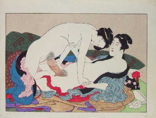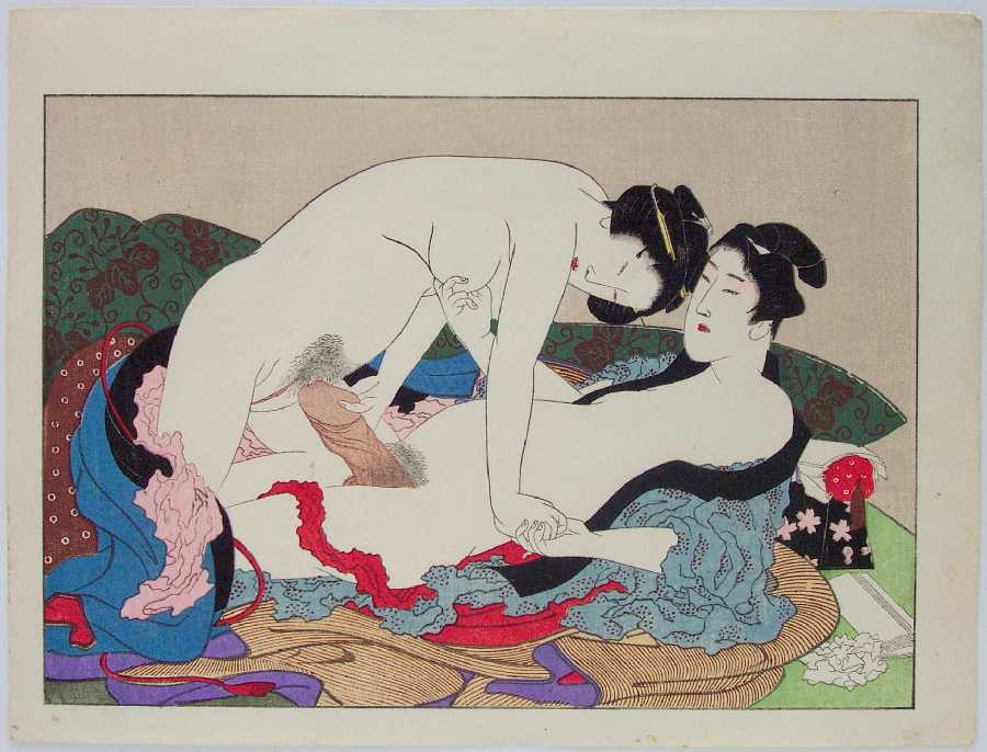 A colorful late-Meiji/Tasiho period "shunga" print. Unsigned--as is often typical due