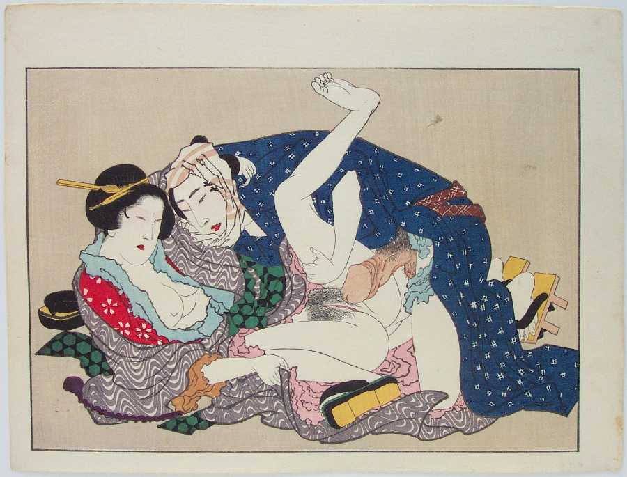 A colorful late-Meiji/Tasiho period "shunga" print. Unsigned--as is often typical due