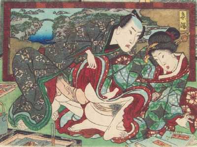 A wonderful surimono-quality "shunga" print in quite good overall condition. |