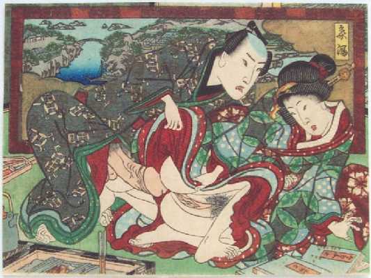 From an album of 12 shunga prints--each scene set before a decorative screen.