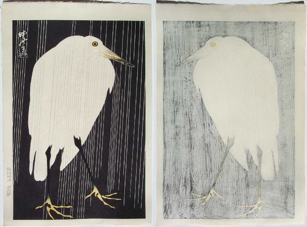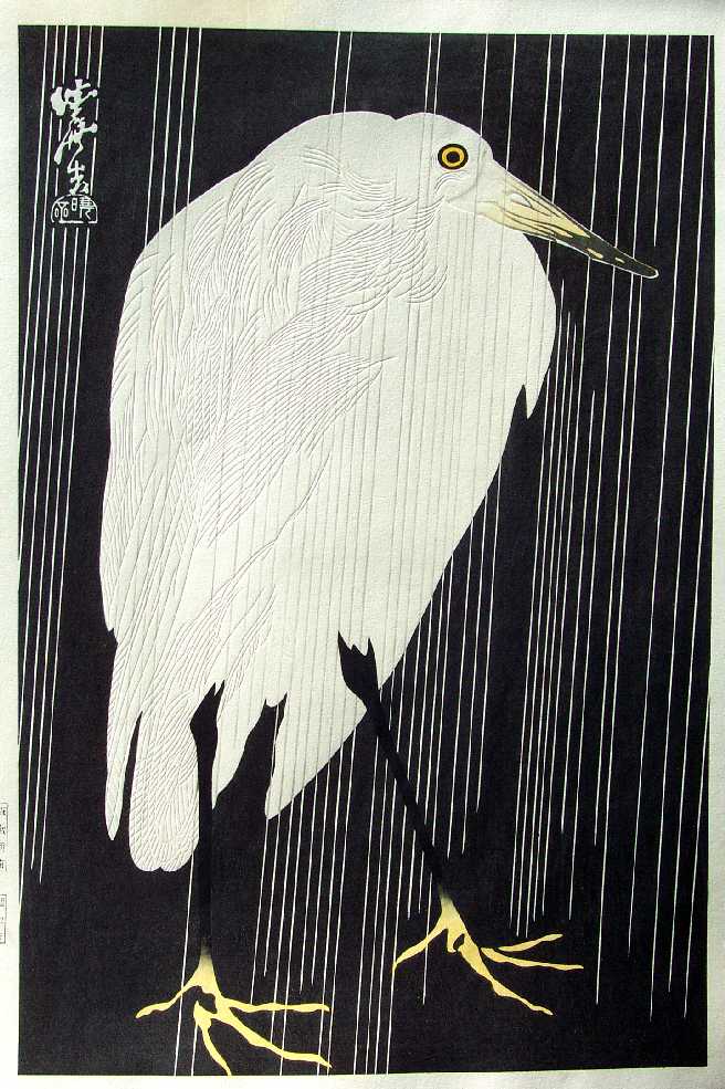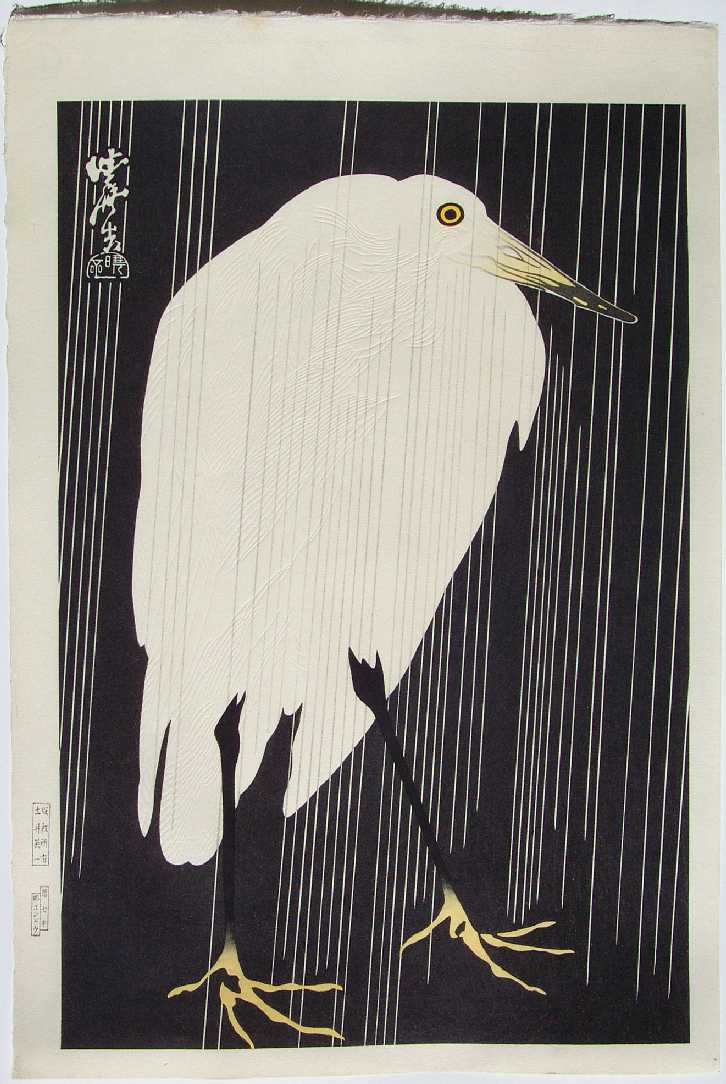 Wonderfully bold print. A deeply embossed white egret standing in a rainfall. Rarely seen print. |