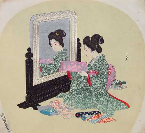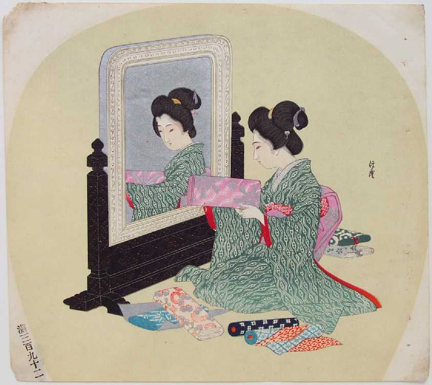 Very Fine. Superbly executed "bokashi" shading; deep "gauffrage" (embossing) to black mirror