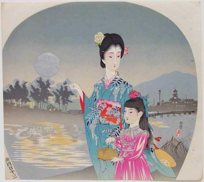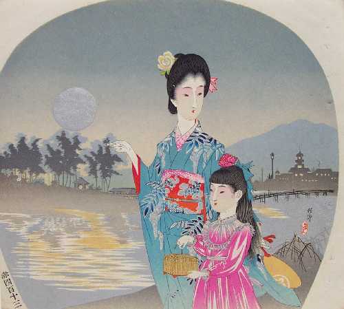 pigments to water area, moon, and kimono; "burnishing" to black hair areas; highly detailed carving.