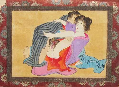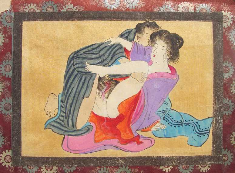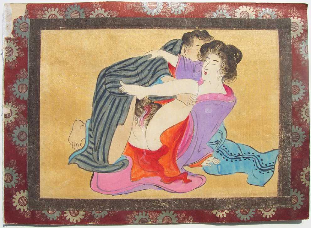 An original "shunga" design, hand-painted onto yellowish-gold silk.