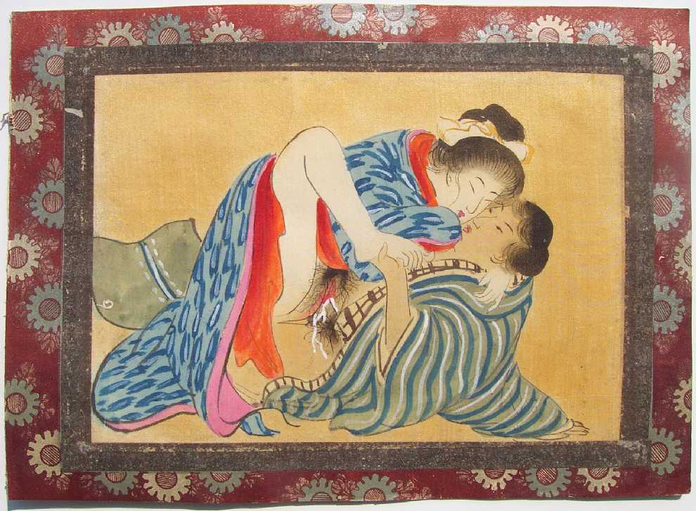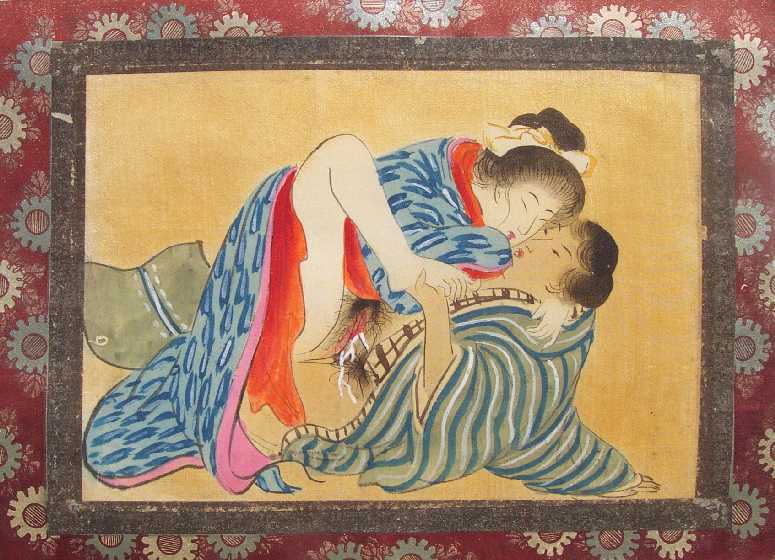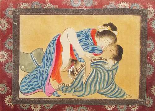 An original "shunga" design, hand-painted onto yellowish-gold silk.
