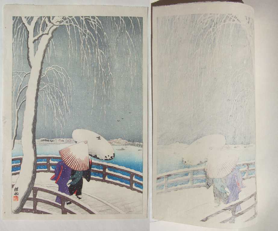 accumulation, umbrealla, and bridge boards; lightly over-splashed "gofun" snow; baren "sujizuri"