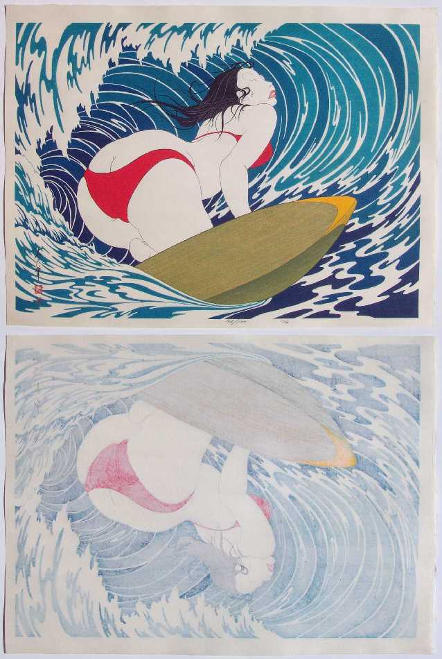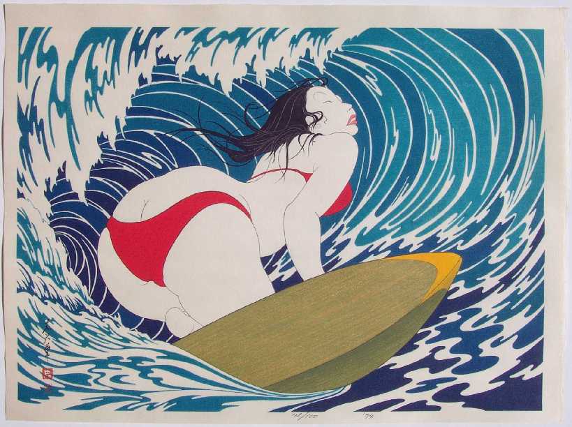 A strikingly voluptuous modern-day "bijin-ga" image--surfing eyes closed under a curling wave.