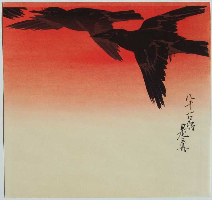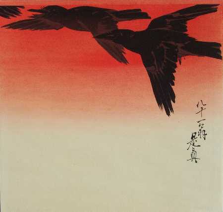Zeshin's classic image of three flying crows, set against a brilliant orange-colored sky. PRE-1923