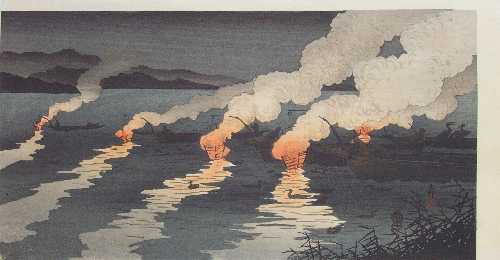 A nicely detailed and colorful image of nightime fishing with fire-pots and