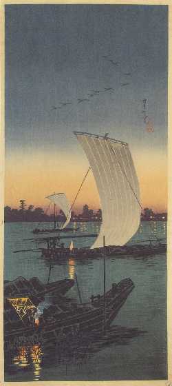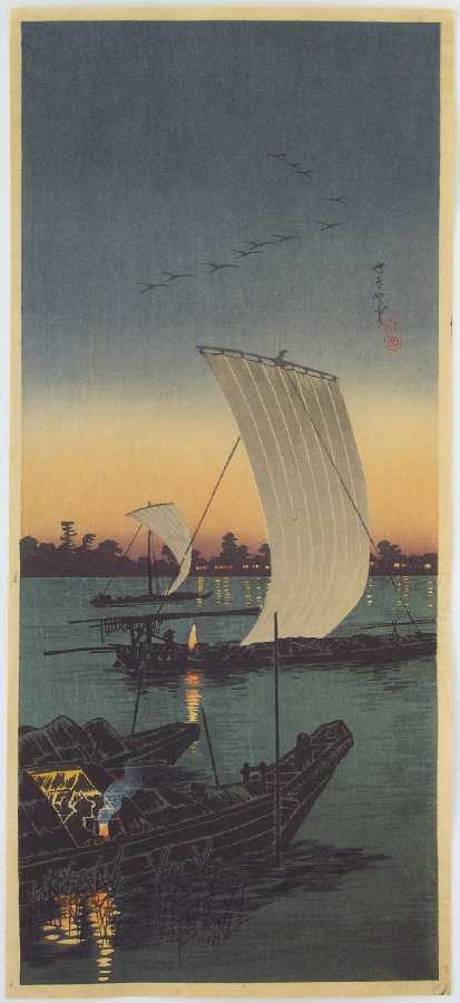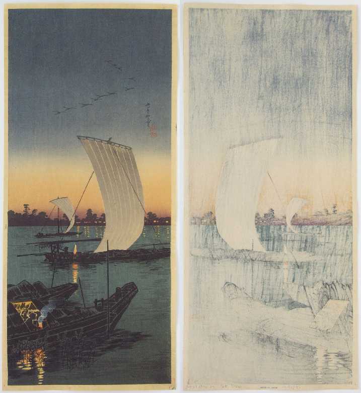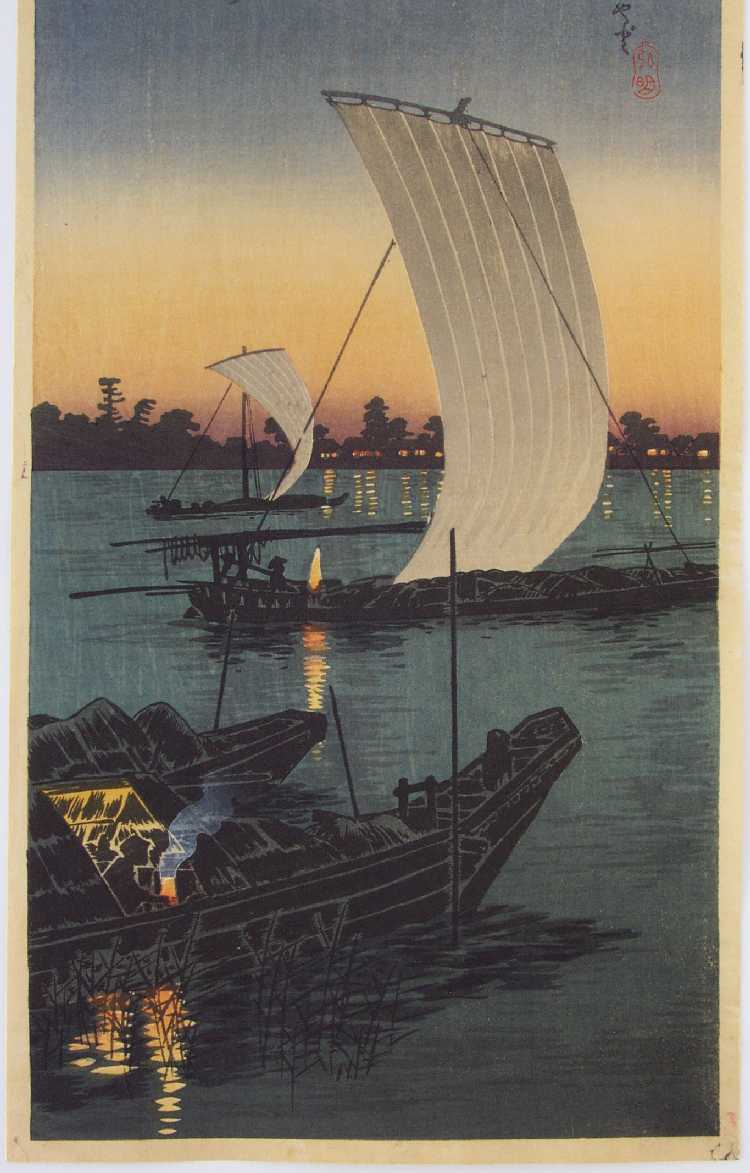 (embossing) to sails and reflections; visible woodgrain to sky; white "gofun"