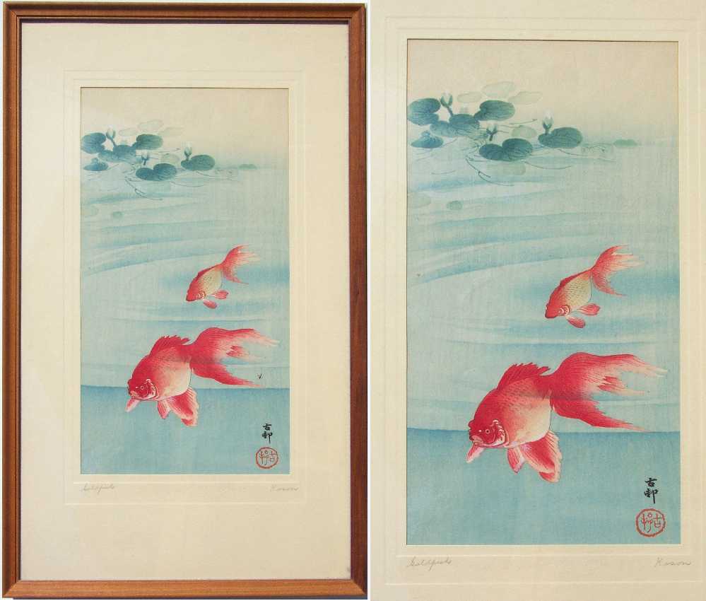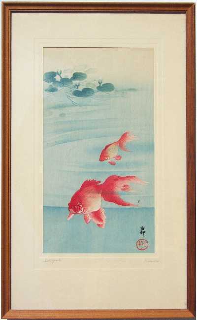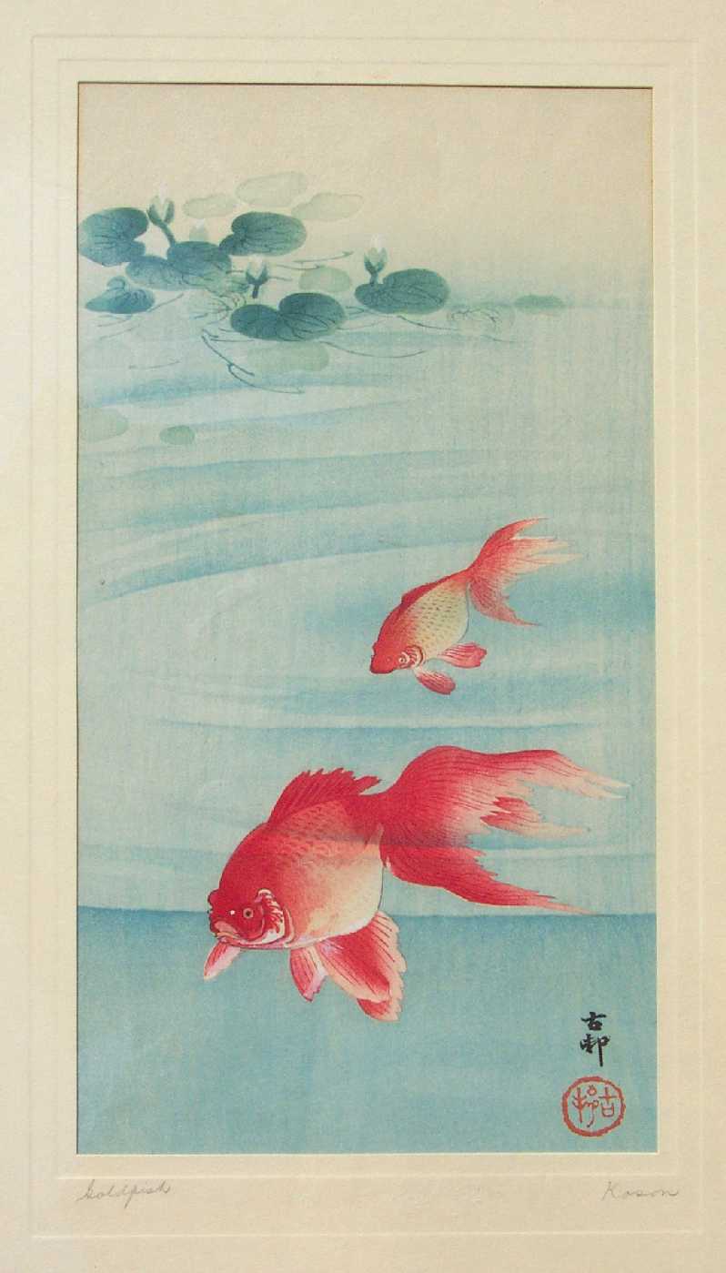 An uncatalouged Koson image of two reddish goldfish. Rarely seen. |