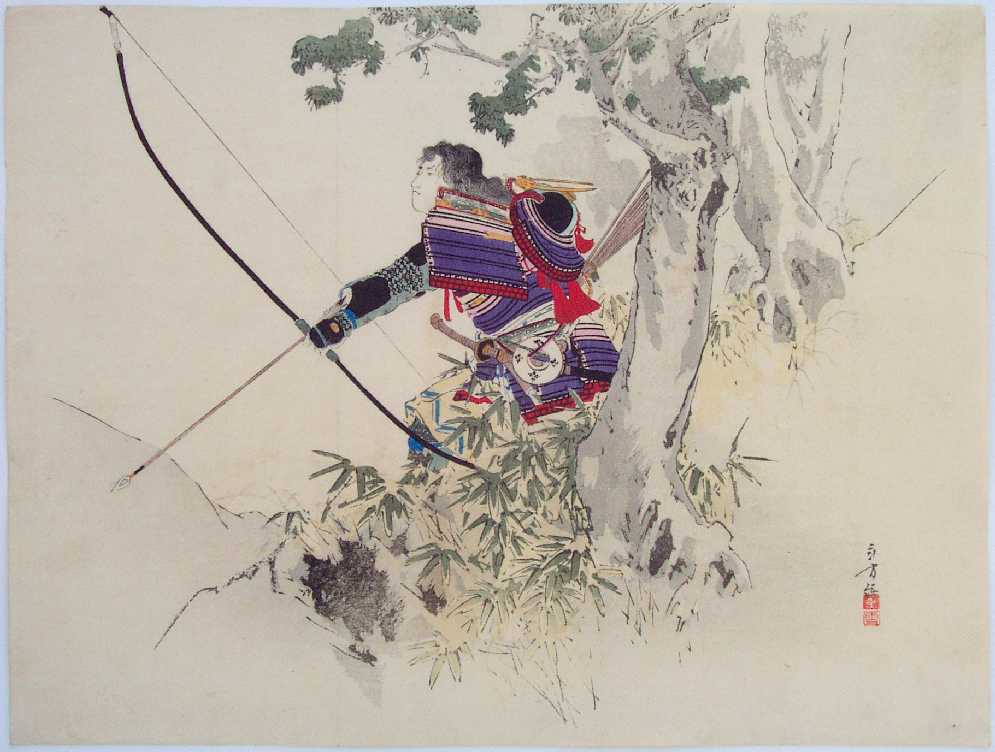 Samurai preparing to aim his long bow at enemy. |
