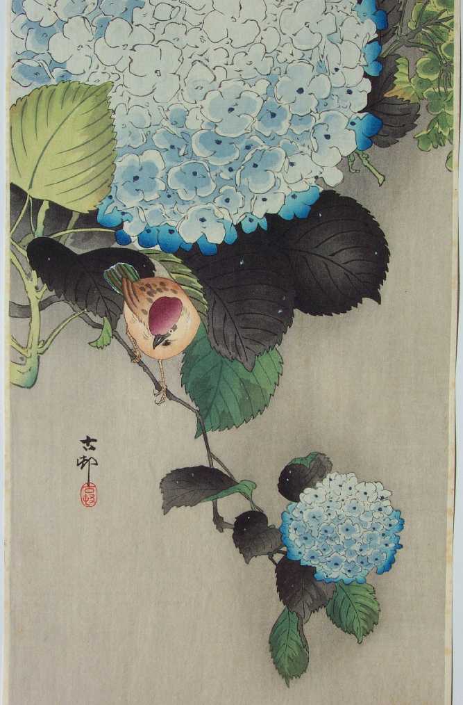 Very Fine. Wonderfully executed "bokashi" shading to hydrangea's leaves and flowers,