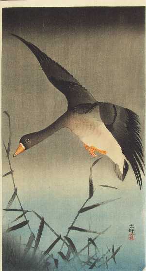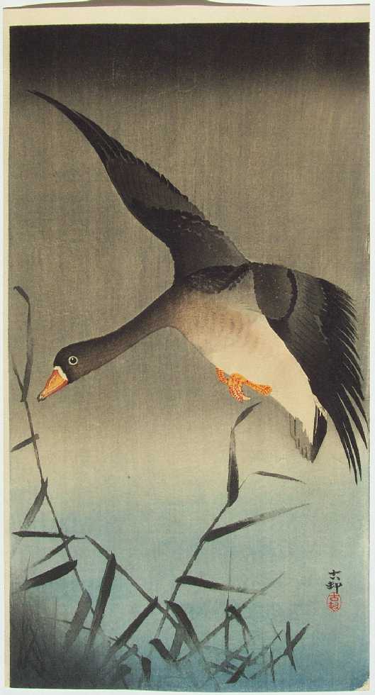 A striking Koson image of a white-fronted goose in flight above reeds. PRE-1923 earthquake (note: