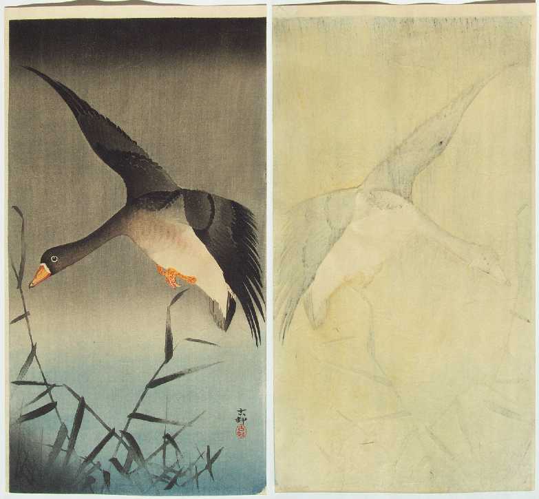 Very Fine. Strikingly superb "bokashi" shading throughout; nicely visible woodgrain entire background; goose's