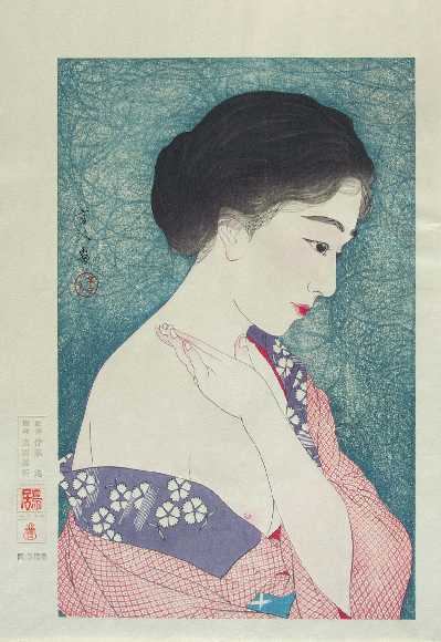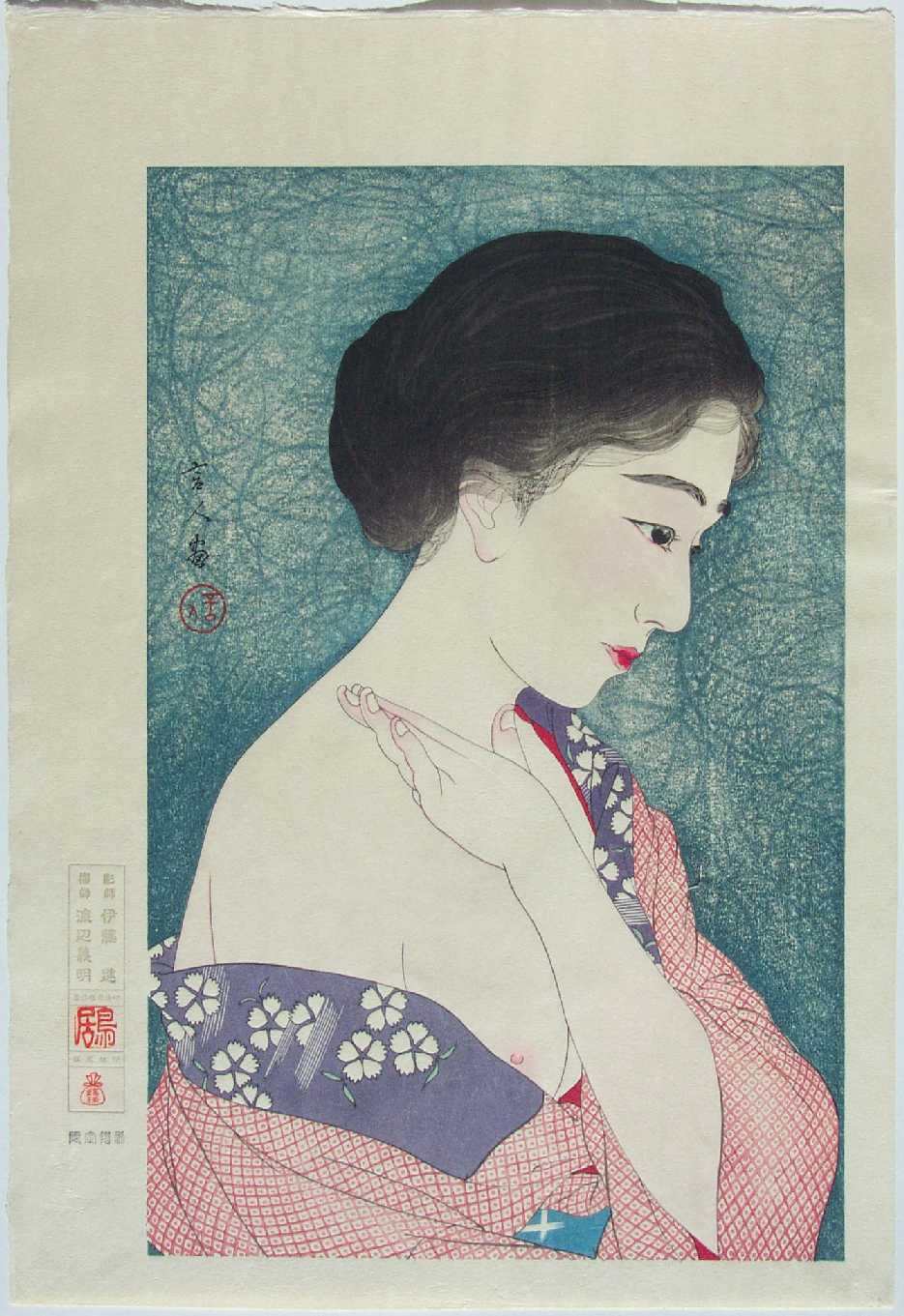 Very Fine. Nicely over-printed hairlines; superb "bokashi" (gradation of colors) shading to face, hand and