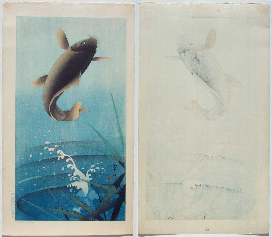 Very Fine. Superbly executed "bokashi" shading to blues and carp's colors; much fine detailing;