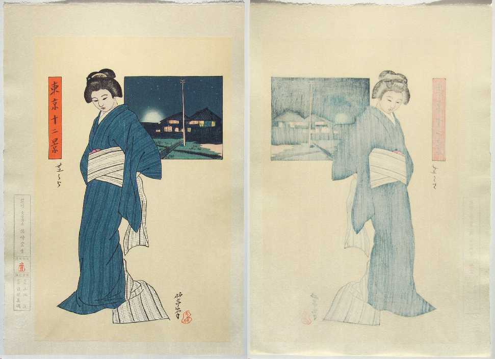One of a 12-print series of prints published 1910/17, as "bijin-ga" images with views of Tokyo