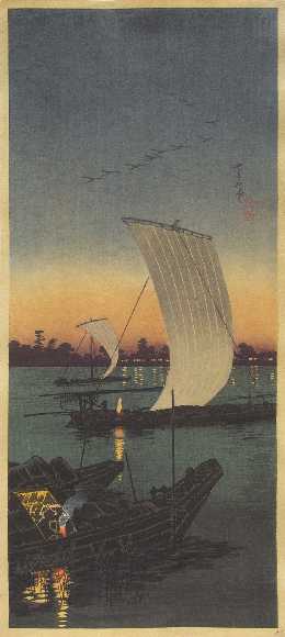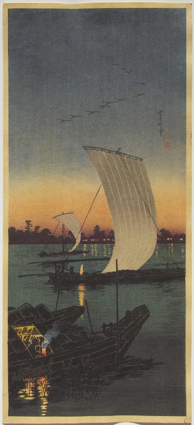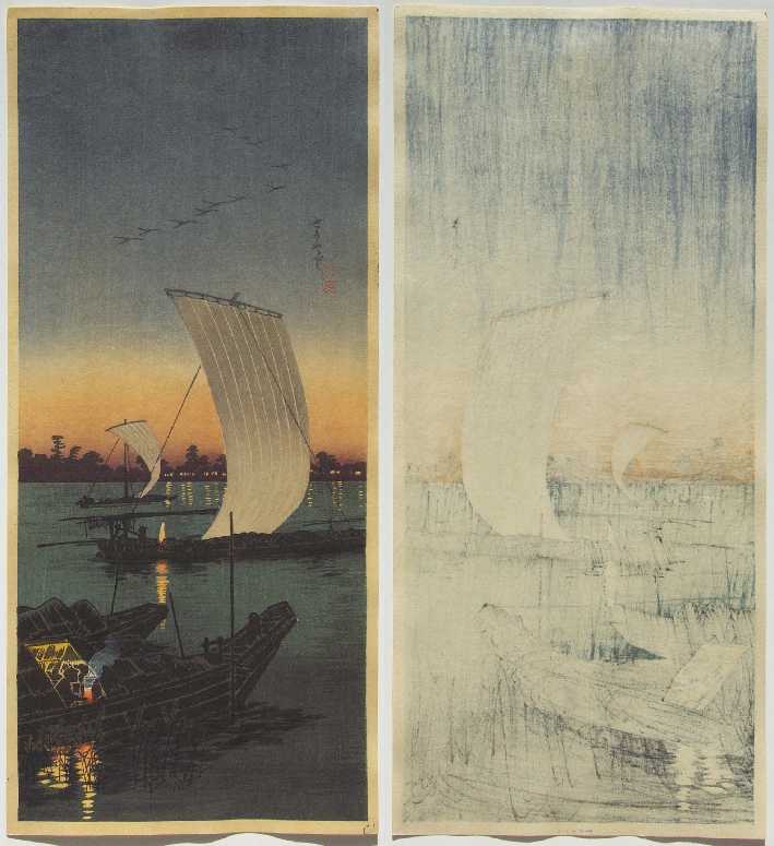 (embossing) to sails and reflections; visible woodgrain to sky; white "gofun"