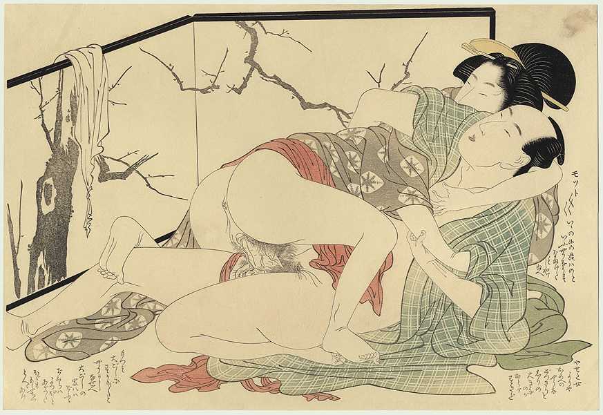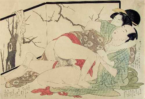 From Utamaro's wonderful 1799 "The Prelude to Desire" series. Full-sized "shunga" prints