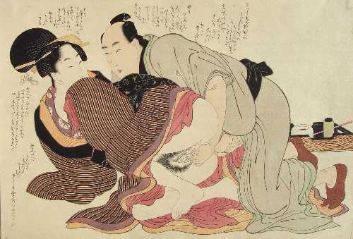 From Utamaro's wonderful 1799 "The Prelude to Desire" series. Full-sized "shunga" prints