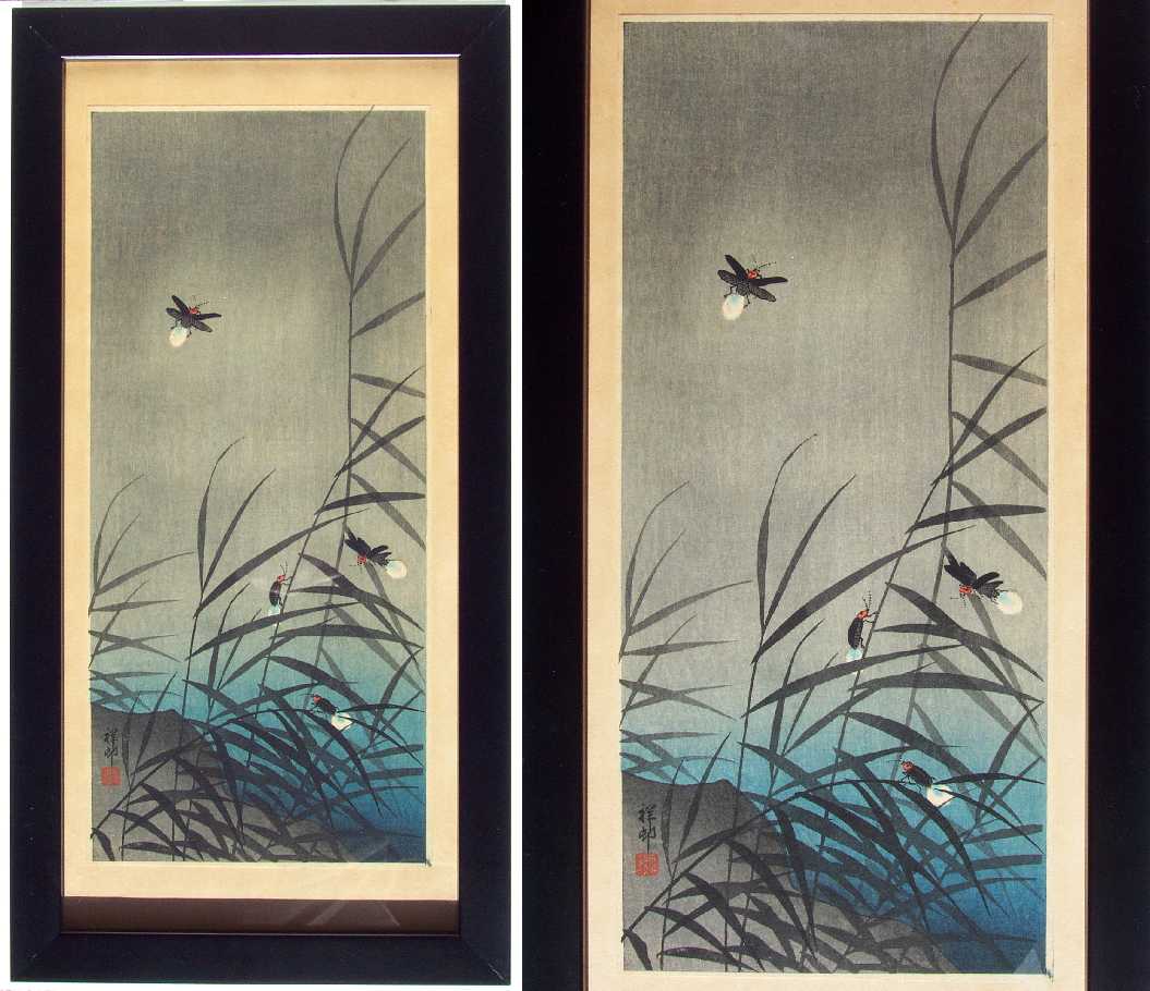 Very Fine. Nicely executed "bokashi" shading to night sky, reeds, rock and water area;