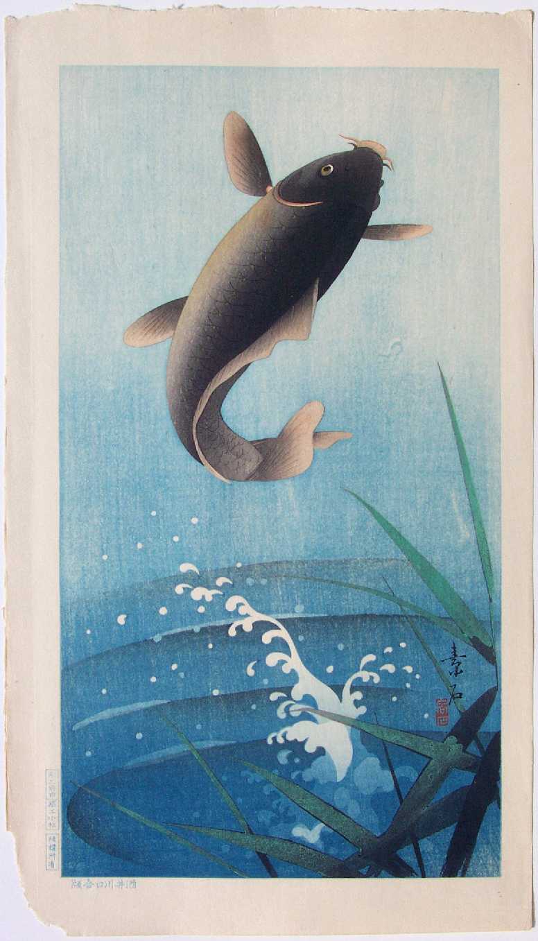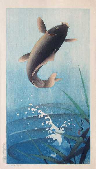 Strikingly beautiful leaping carp image. Soseki was a contemporary of Koson, producing