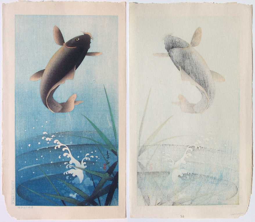 much fine detailing; woodgrain visible. (Minor blue "color irregularity" right of carp.) |