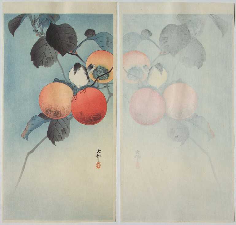 Very Fine. Superbly executed "bokashi" shading to foliage, persimmon fruits, and soft blue background; crisp lines,