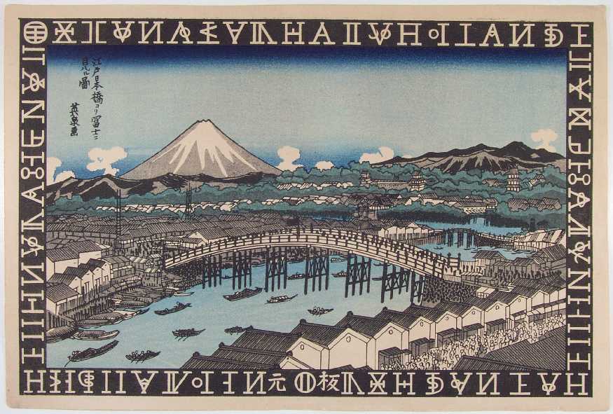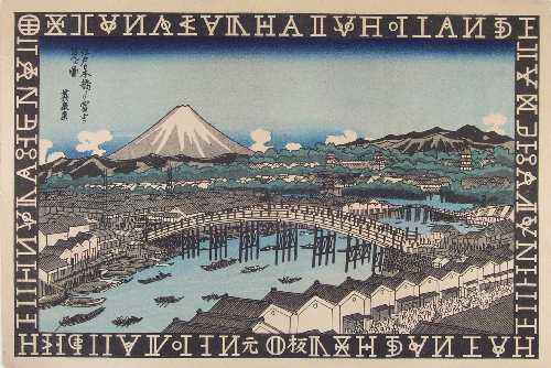 A bold panoramic image of Ryogoku Bridge over the Sumida River in Edo--with black