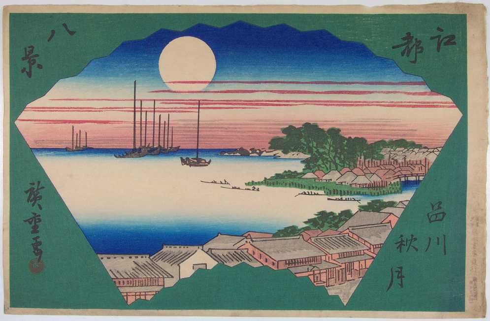 Boldly bordered in dark green--a delightful "fan-print style" series of early Edo views. |
