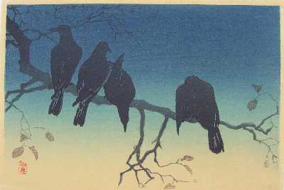 A beautiful nighttime image--four crow silhouetted against a deep blue sky. Rarely seen. |