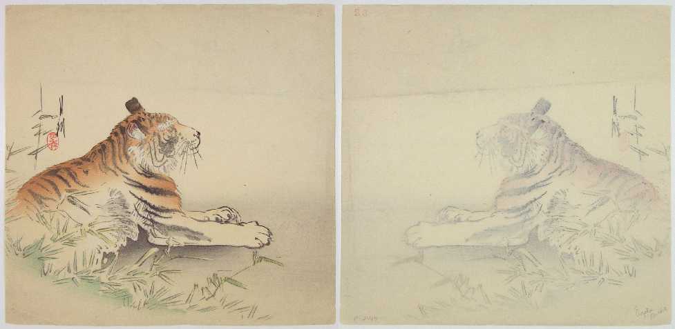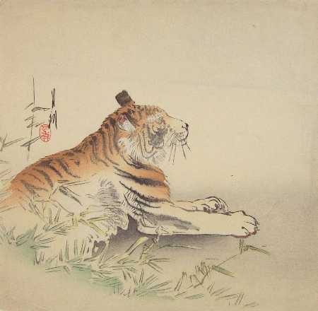 A tiger at rest in bamboo. (A similar Koson "Reclining Tiger" image exists.) |