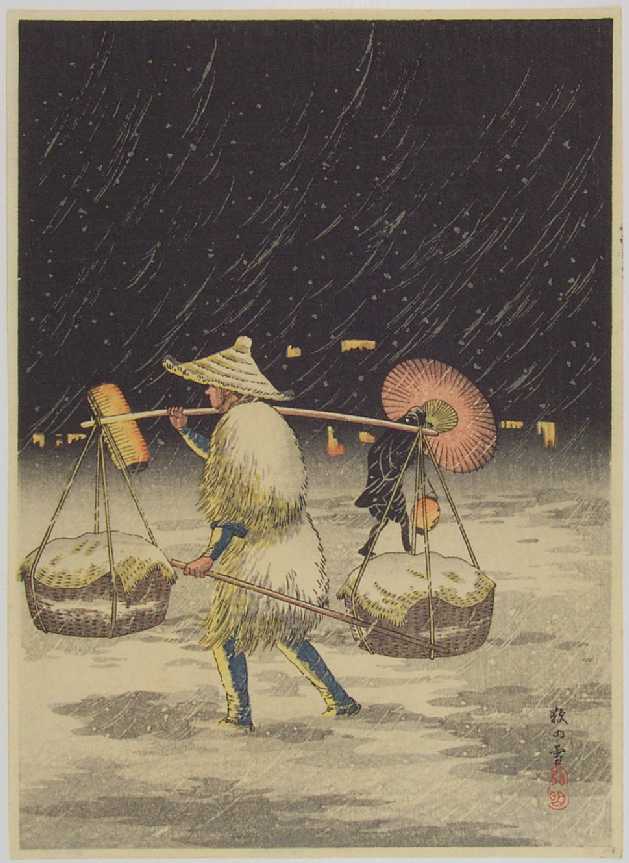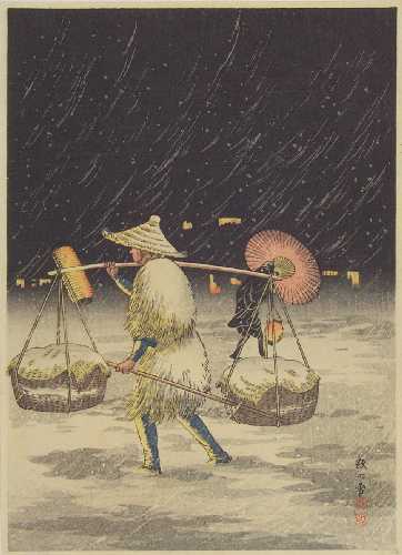 A heavily-ladden peddler seen on a snowy night. A seldom-seen print. |