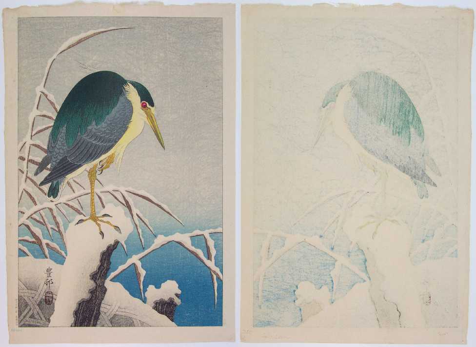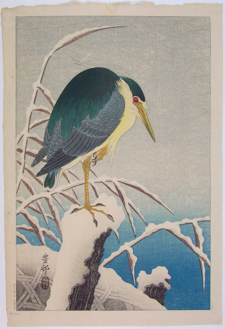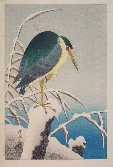 Very Fine. Superbly executed soft "bokashi" shading to heron, snow-covered areas, and background; light