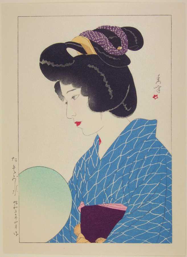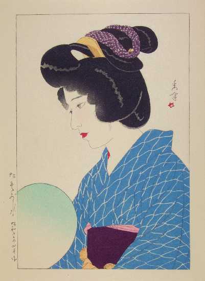 with a hand-held fan. One of Shuho's few early bijin-ga designs. A smaller format