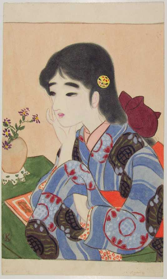 An original (one-of-a-kind) "bijin-ga" design executed in sumi and color pigments on "old paper." |
