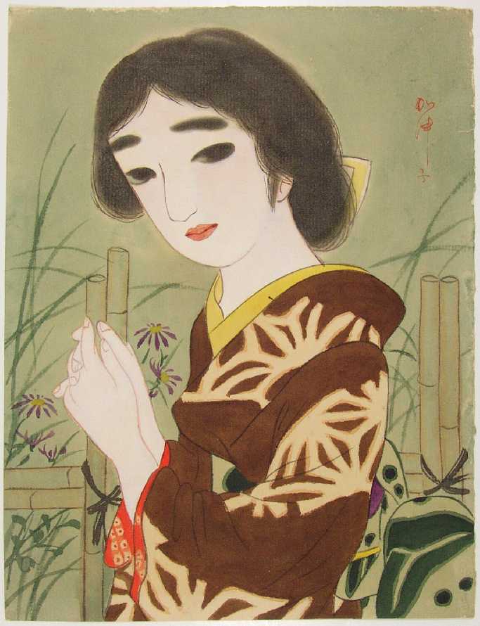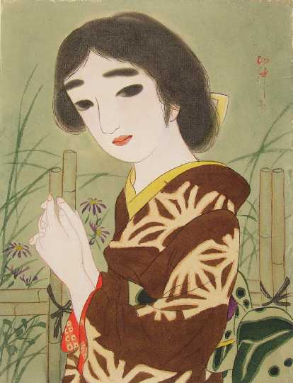A charmingly beautiful "bijin-ga" design, hand-painted onto age-mellowed