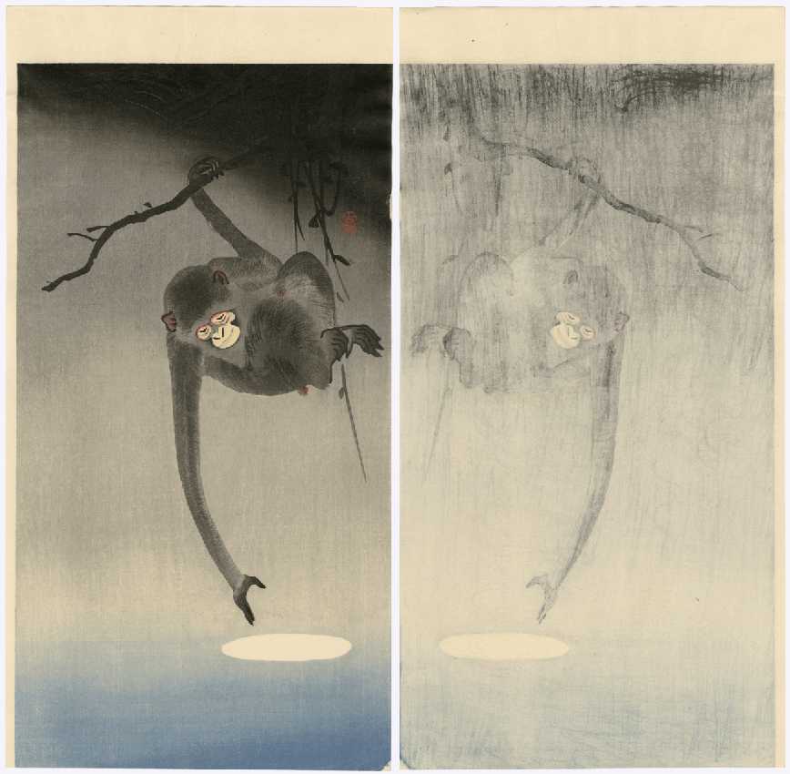 Very Fine. Superbly executed "bokashi" shading throughout; nicely visible woodgrain entire background; the