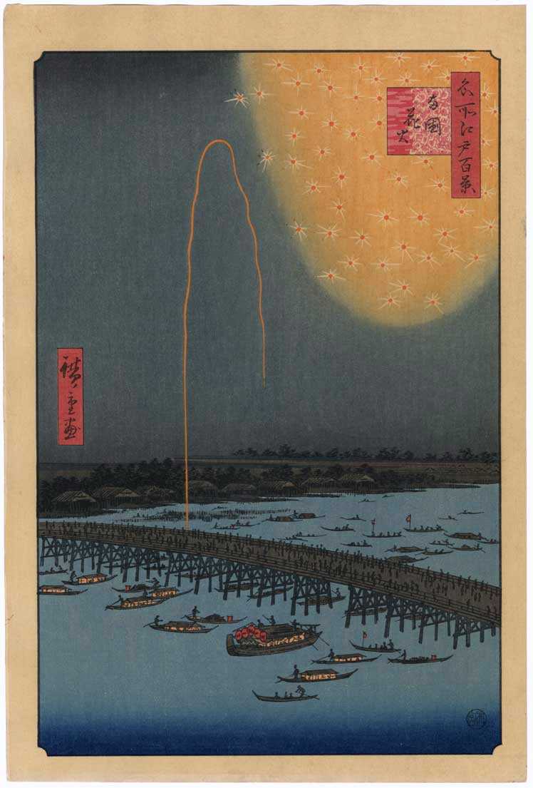 A spectacular fireworks image--one of Hiroshige's most dramatic designs.