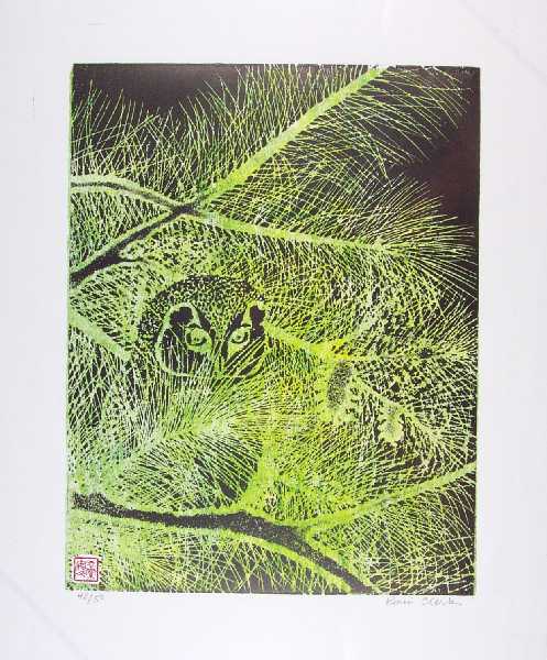 A "hidden owl" design--hiding in the dense foliage of a pine tree.