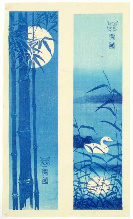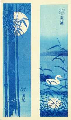 format) prints of birds/bamboo designs done as "azuri-e" (shades of blue).