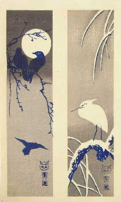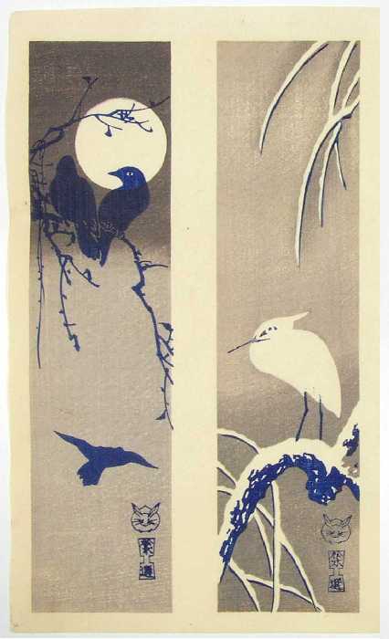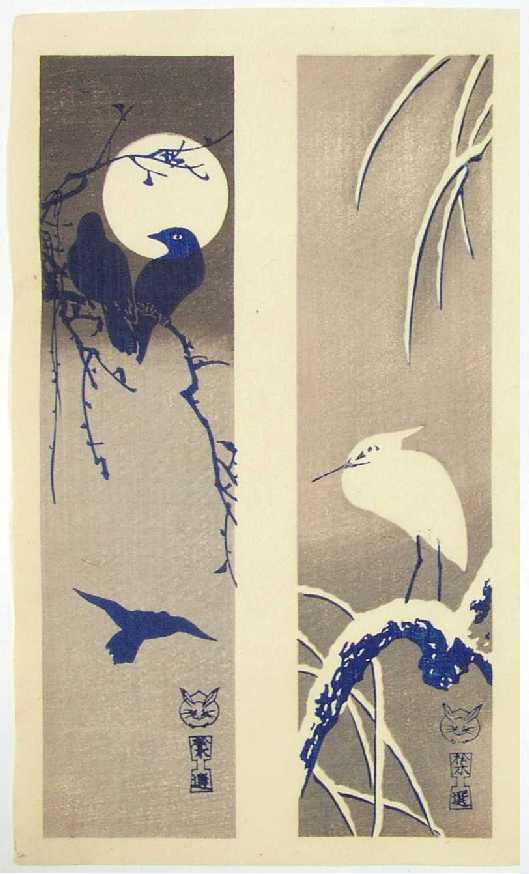 format) prints of birds/moons/snow designs done in "sepia" (shades of brown).