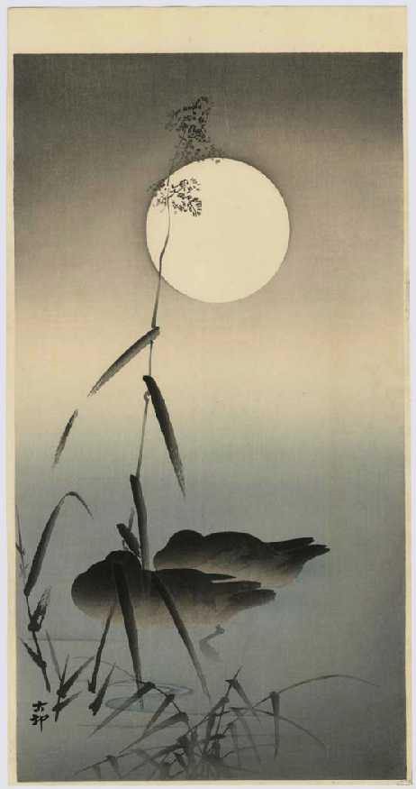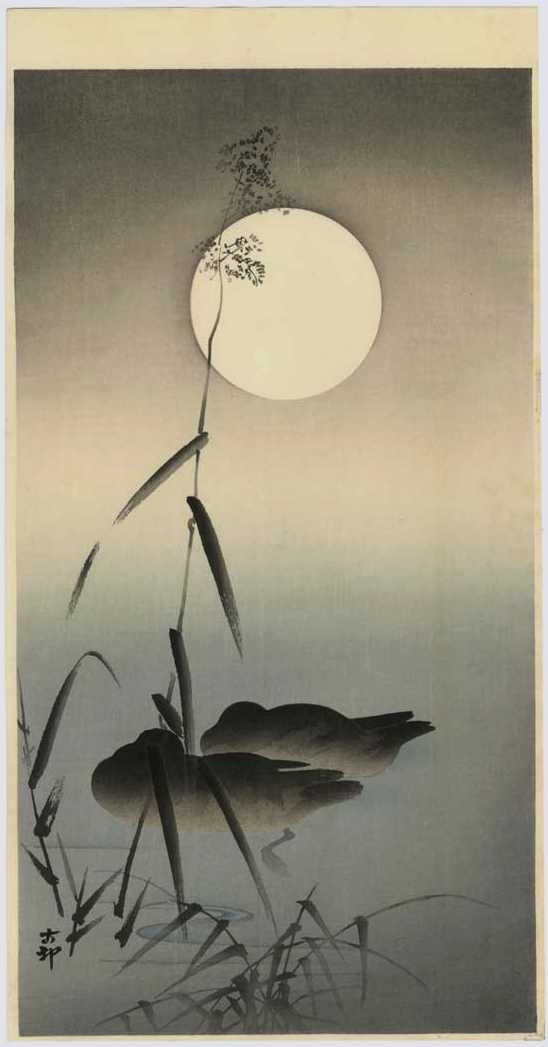 A gorgeous Koson image of two mallard ducks sleeping peacefully under a reed-silhouetted full moon.