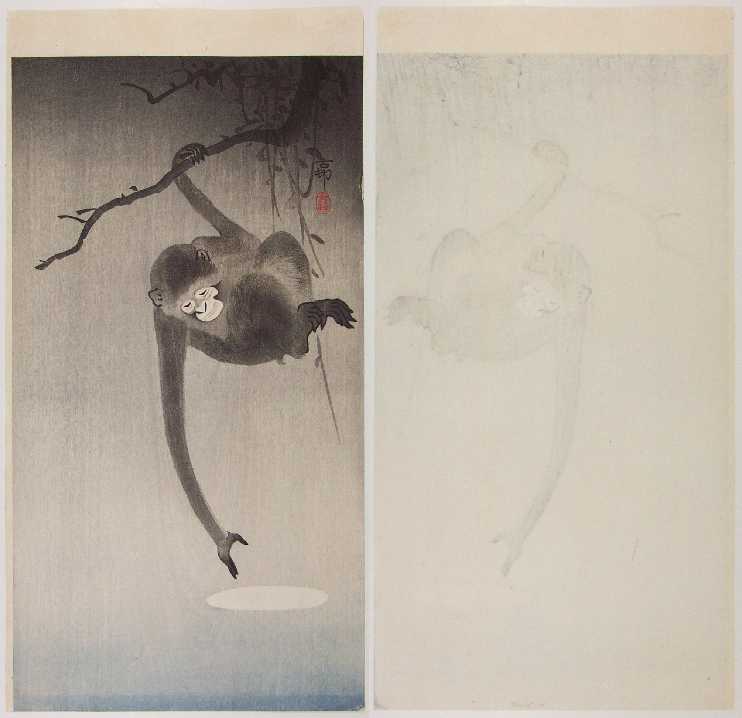 Very Fine. Superbly executed "bokashi" shading throughout; nicely visible woodgrain entire background; the