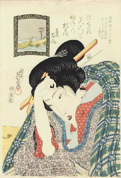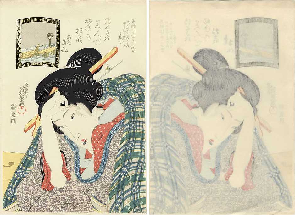 Very Fine. Skillfully executed "bokashi" shading; "gauffrage" to kimono and title cartouche;
