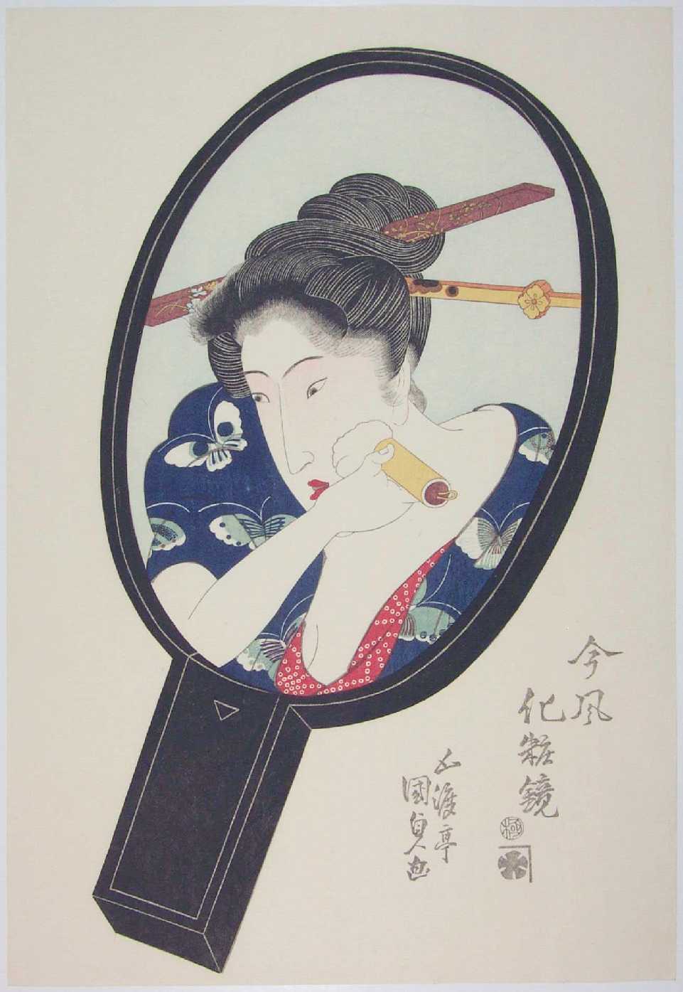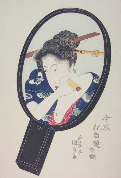of a black lacquered hand-mirror. From an early series of 10 Kunisada