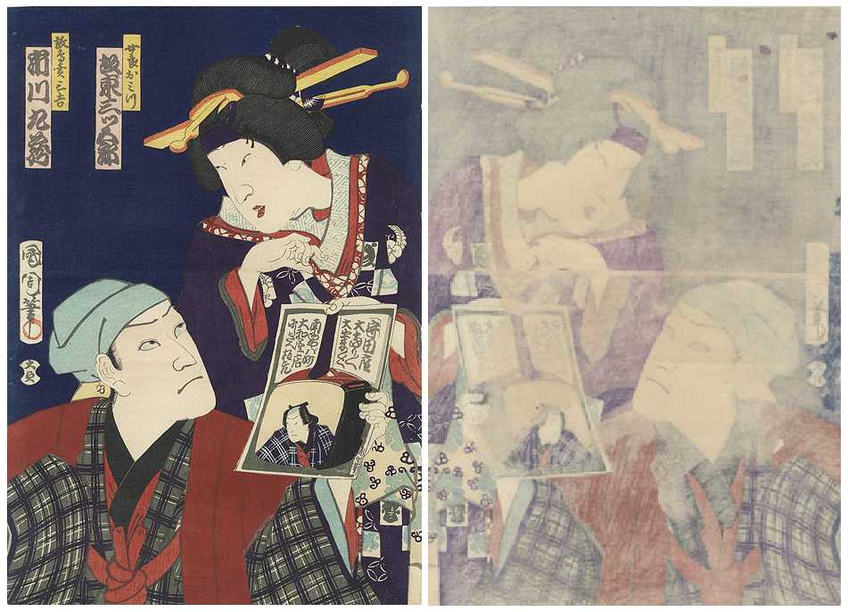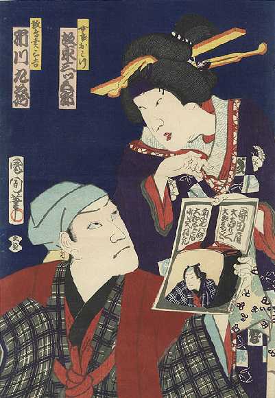 onto a shamisen. (Actors are Bando Mitsugaro and Ichikawa Kuzo.) |