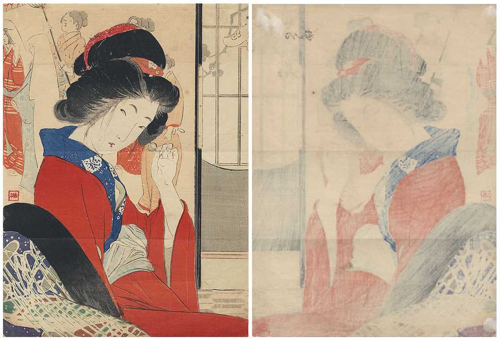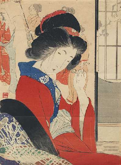 Very Fine. Nicely executed "bokashi" shading; light "gauffrage" to kimono;